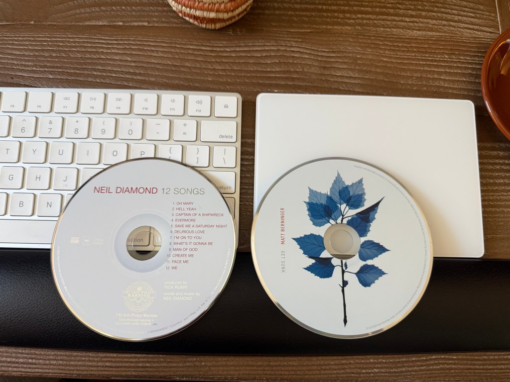 Pressed Eject to put the disc on the right in, and the one on the left came out and I was surprised to see how similar they looked to each other. They are 20 years apart, but I couldn’t guess if the Diamond CD’s design is native to 20 years ago. Actually, 20 years ago, the album’s release was a controversy. Reportedly without informing either Diamond or Rubin, Columbia Records put tracking software on the first CD issue that reported back to them when anyone put it into a computer’s CD-ROM drive. There was an uproar and they had to reissue the CDs but at that point, the music, the Diamond/Rubin teaming, was never the news about the record.